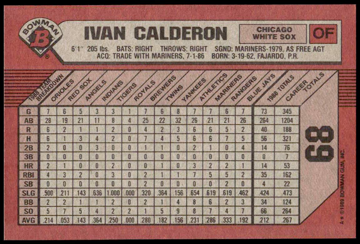 This Baseball card, from 1989 is part of the Bowman  card set. Ivan Calderon is featured and has a card number of 68.