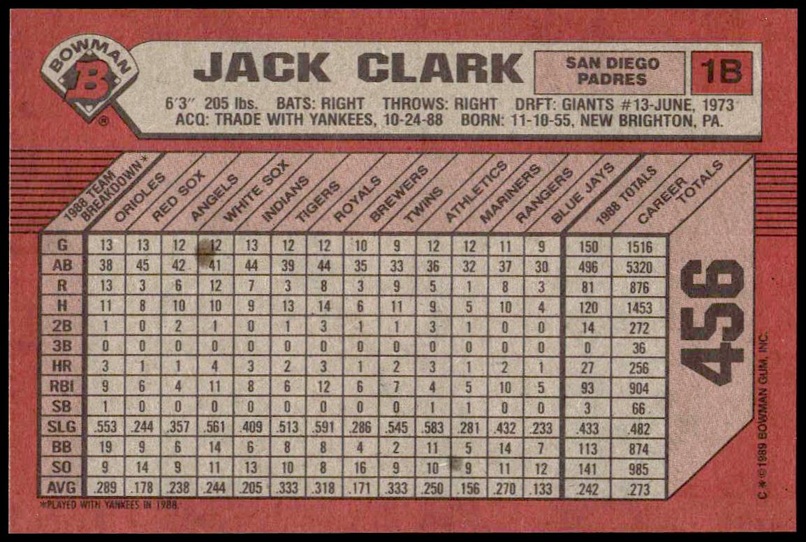 This Baseball card, from 1989 is part of the Bowman  card set. Jack Clark is featured and has a card number of 456.