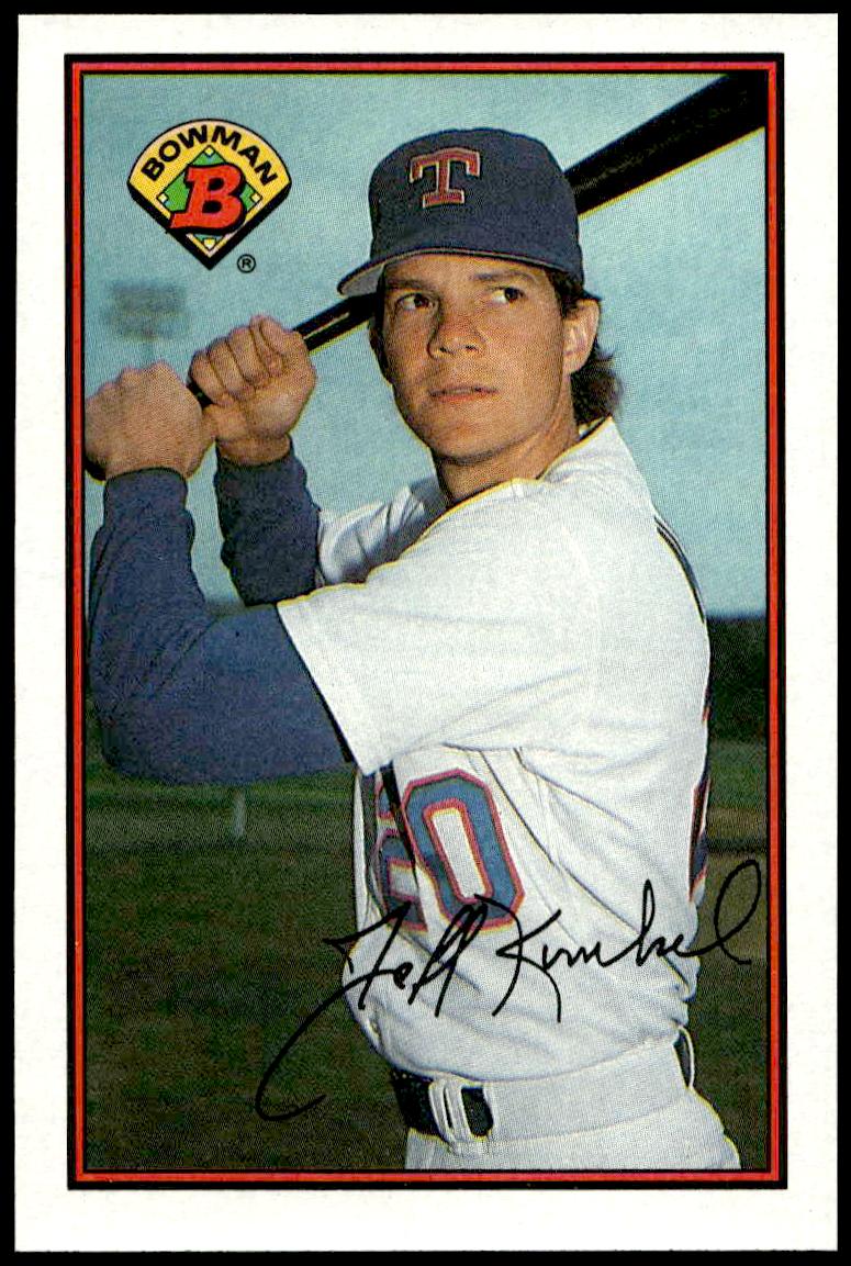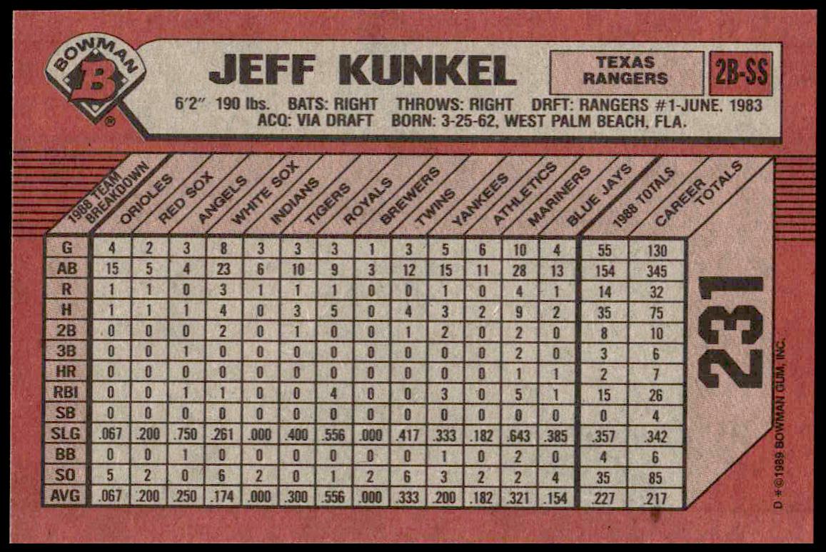 This Baseball card, from 1989 is part of the Bowman  card set. Jeff Kunkel is featured and has a card number of 231.