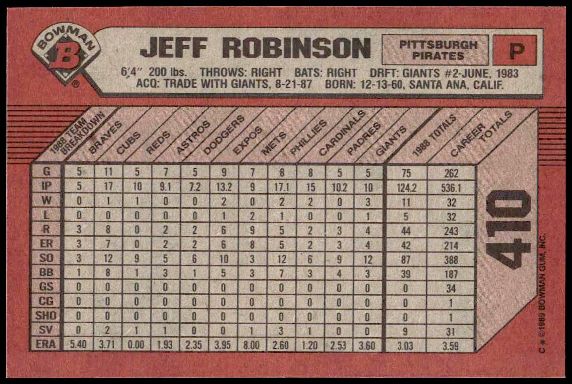 This Baseball card, from 1989 is part of the Bowman  card set. Jeff Robinson is featured and has a card number of 410.