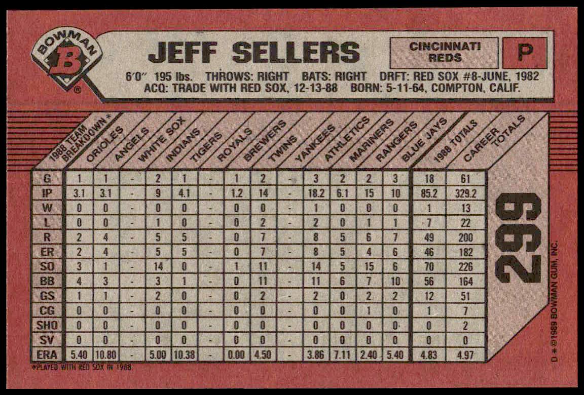 This Baseball card, from 1989 is part of the Bowman  card set. Jeff Sellers is featured and has a card number of 299.
