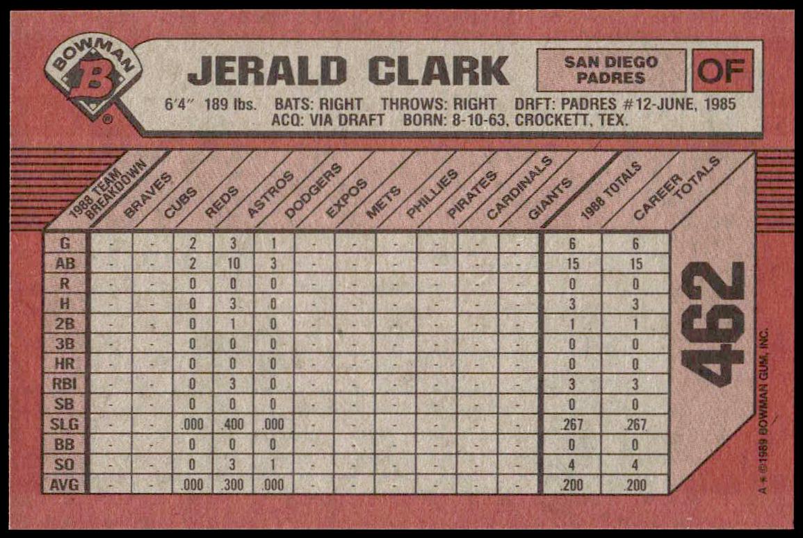 This Baseball card, from 1989 is part of the Bowman  card set. Jerald Clark is featured and has a card number of 462.