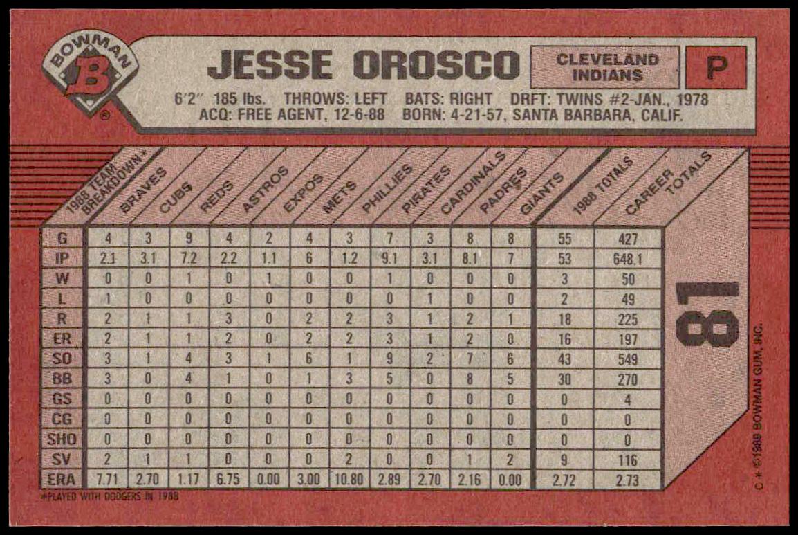 This Baseball card, from 1989 is part of the Bowman  card set. Jesse Orosco is featured and has a card number of 81.