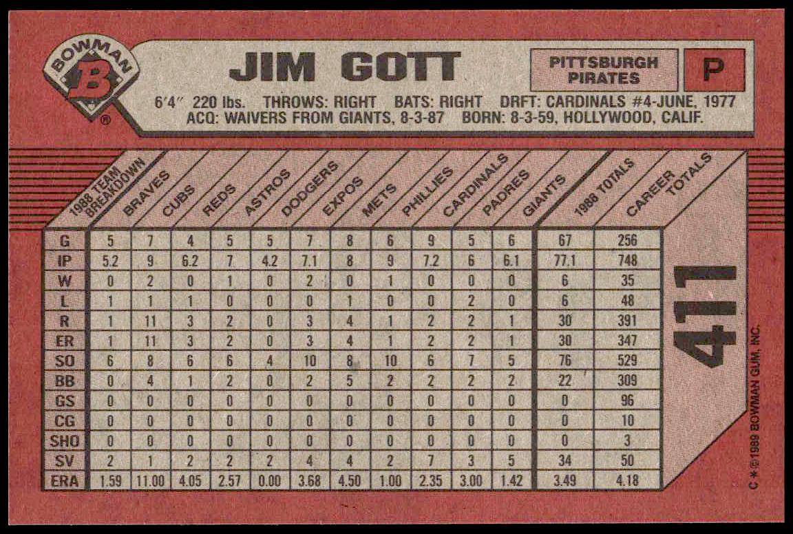 This Baseball card, from 1989 is part of the Bowman  card set. Jim Gott is featured and has a card number of 411.