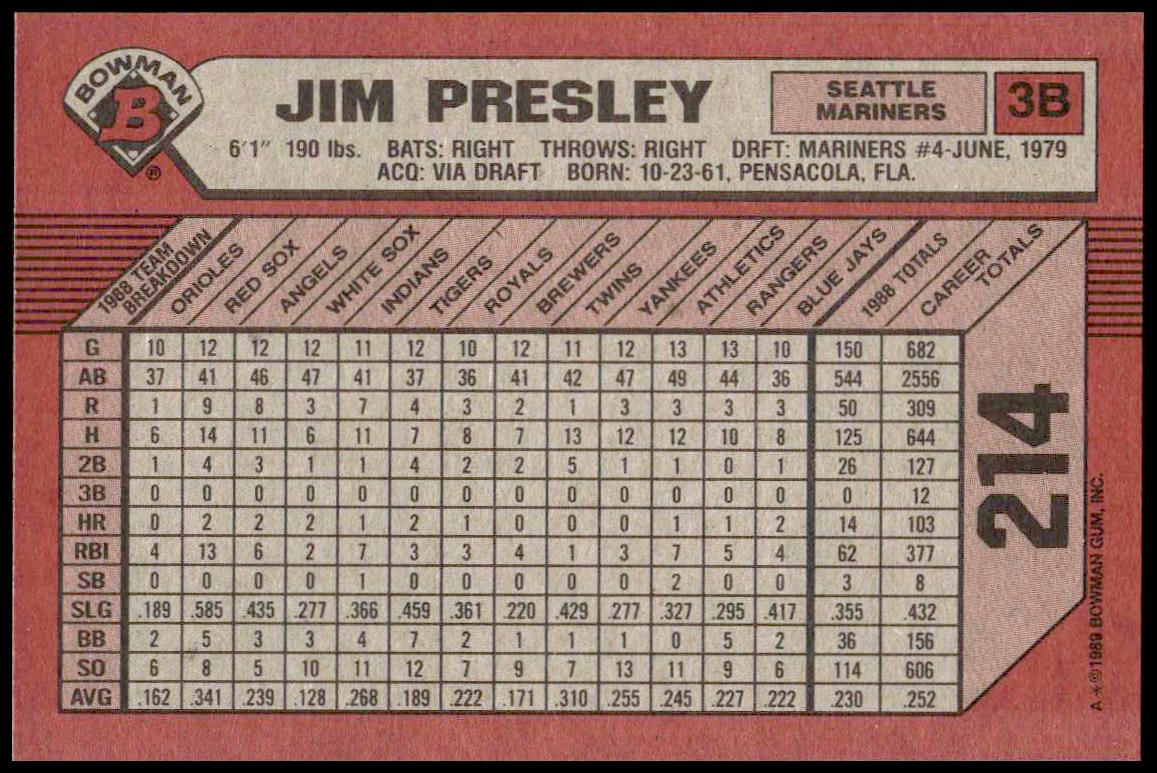 This Baseball card, from 1989 is part of the Bowman  card set. Jim Presley is featured and has a card number of 214.