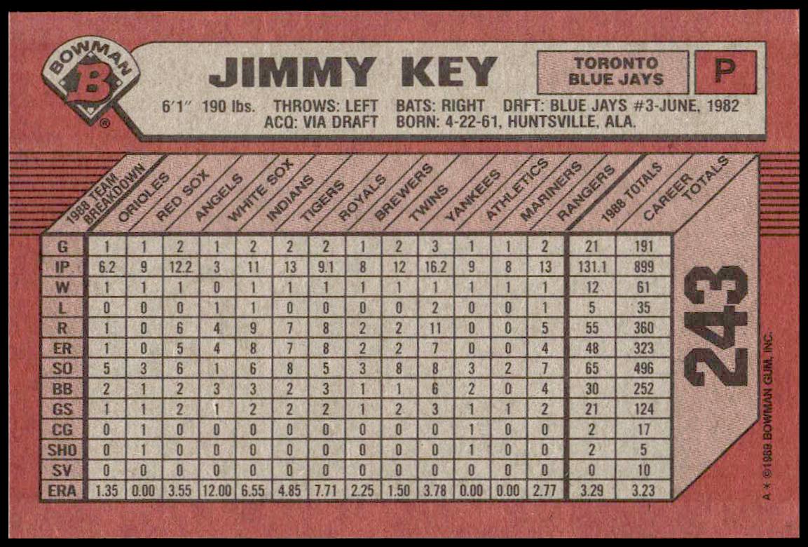 This Baseball card, from 1989 is part of the Bowman  card set. Jimmy Key is featured and has a card number of 243.