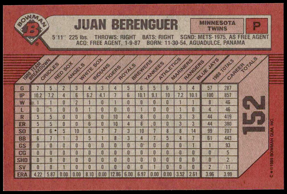 This Baseball card, from 1989 is part of the Bowman  card set. Juan Berenguer is featured and has a card number of 152.