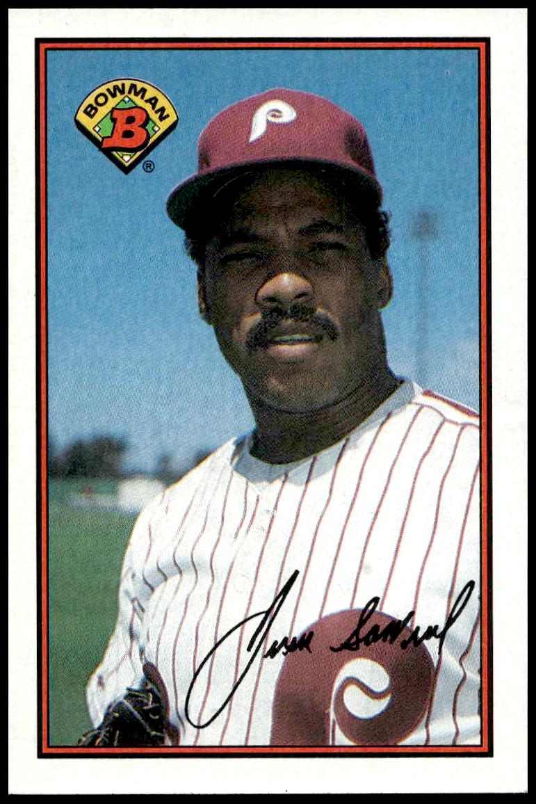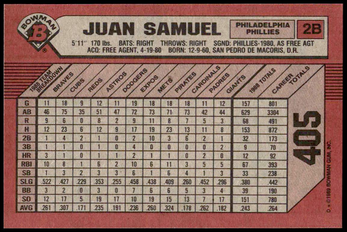 This Baseball card, from 1989 is part of the Bowman  card set. Juan Samuel is featured and has a card number of 405.