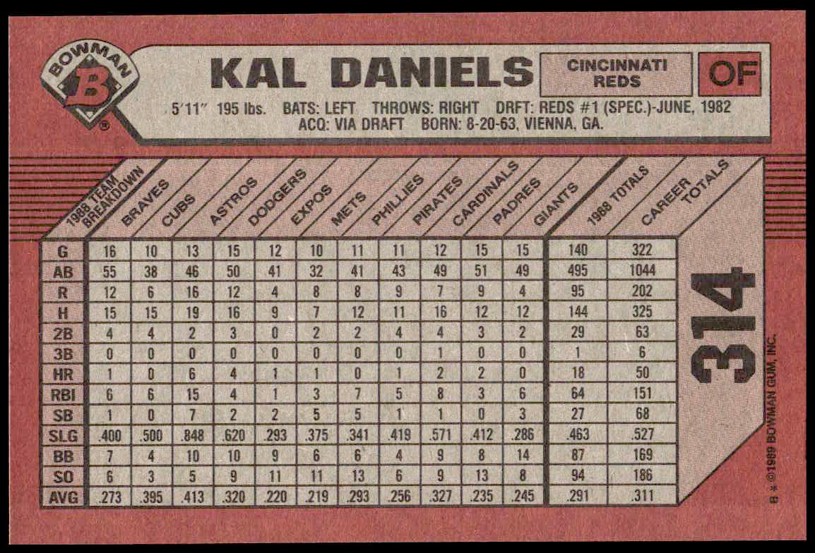 This Baseball card, from 1989 is part of the Bowman  card set. Kal Daniels is featured and has a card number of 314.