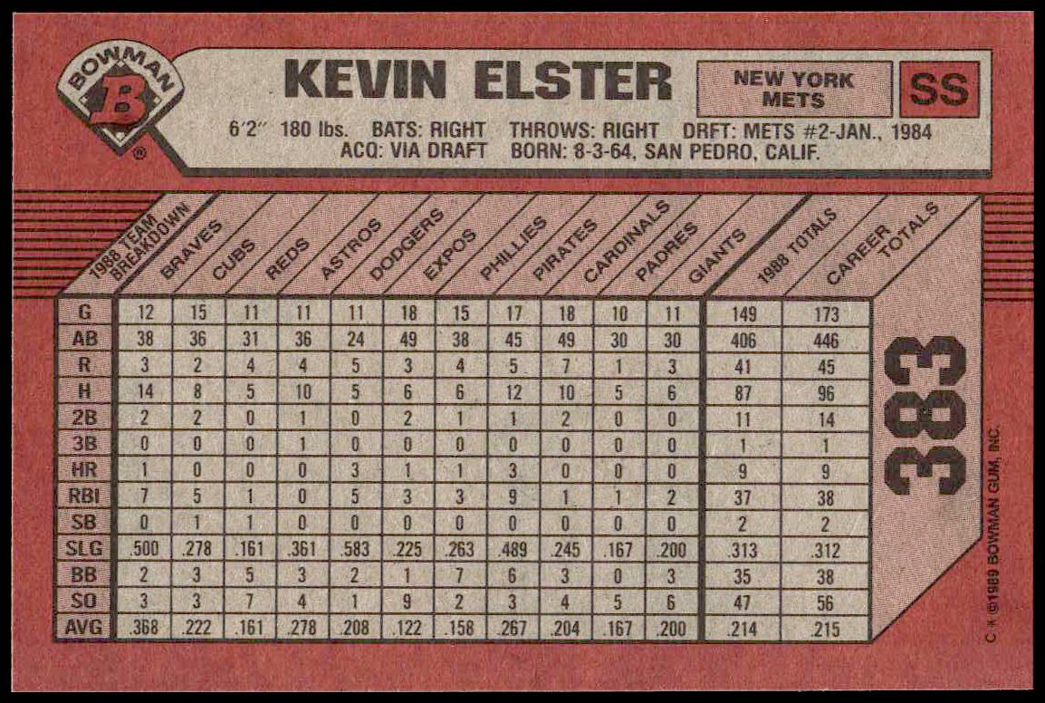 This Baseball card, from 1989 is part of the Bowman  card set. Kevin Elster is featured and has a card number of 383.