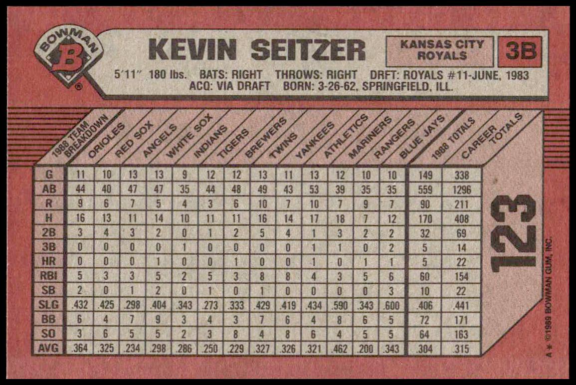 This Baseball card, from 1989 is part of the Bowman  card set. Kevin Seitzer is featured and has a card number of 123.