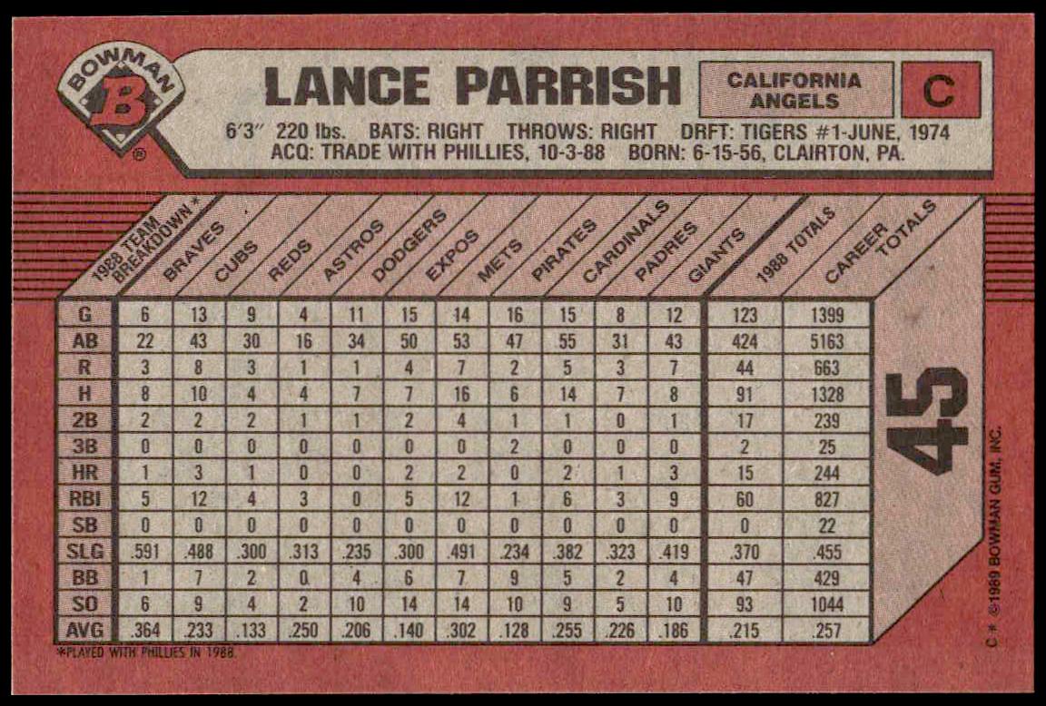This Baseball card, from 1989 is part of the Bowman  card set. Lance Parrish is featured and has a card number of 45.