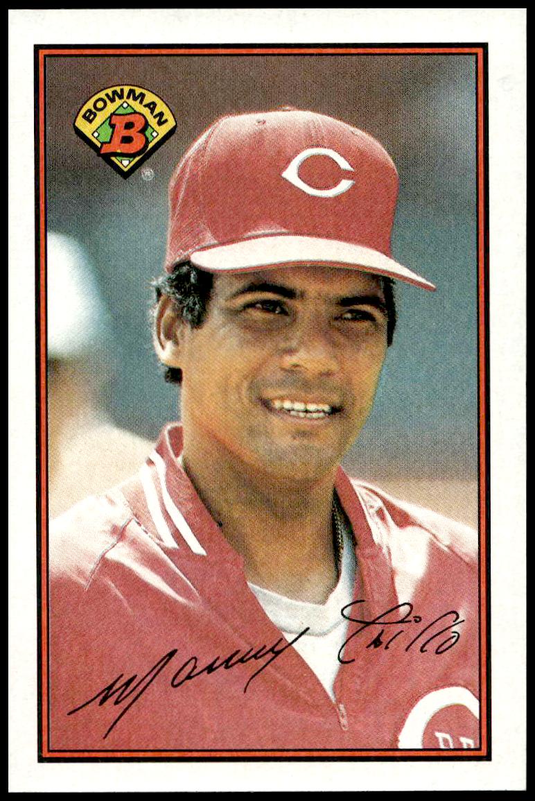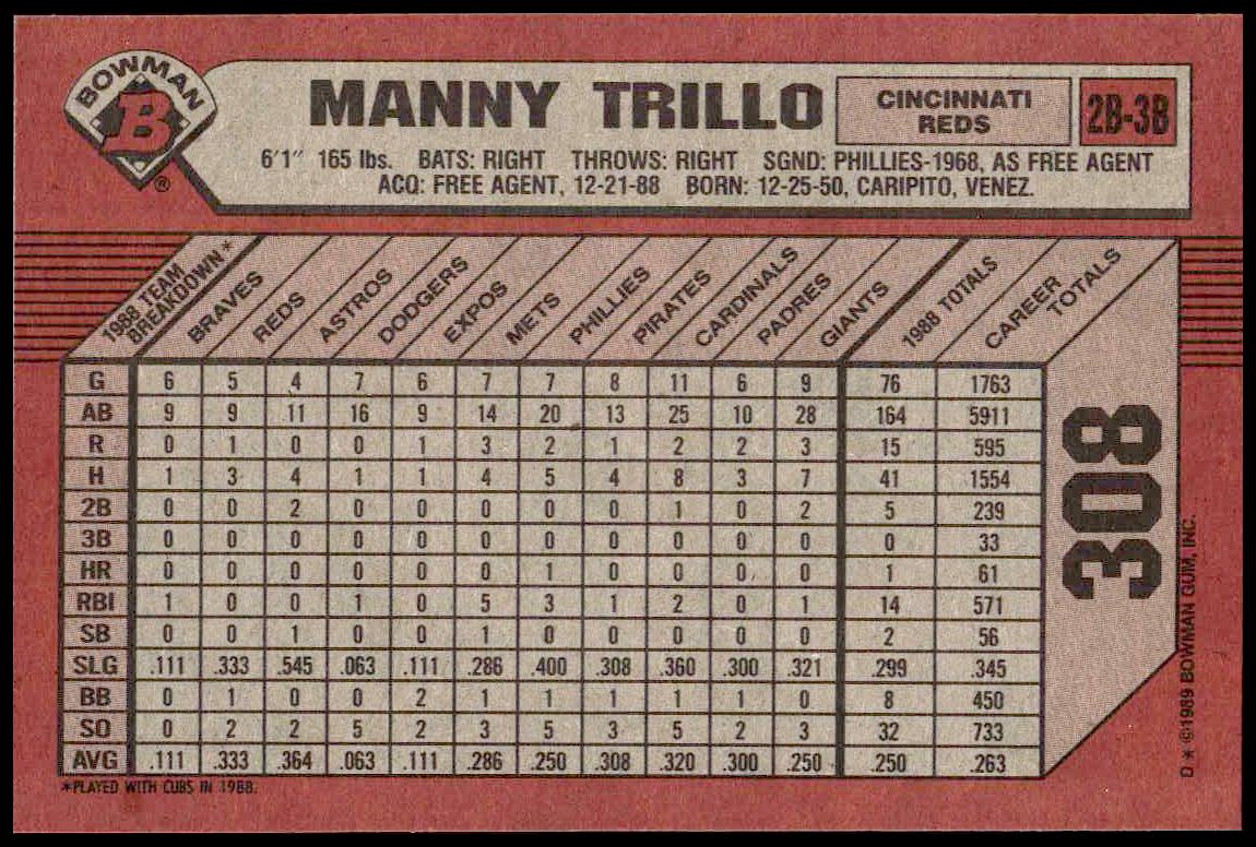 This Baseball card, from 1989 is part of the Bowman  card set. Manny Trillo is featured and has a card number of 308.
