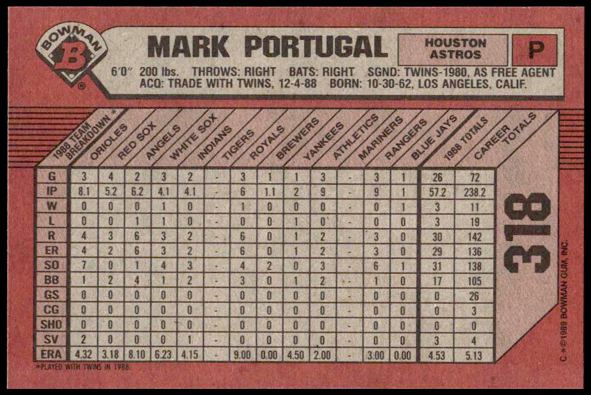 This Baseball card, from 1989 is part of the Bowman  card set. Mark Portugal is featured and has a card number of 318.