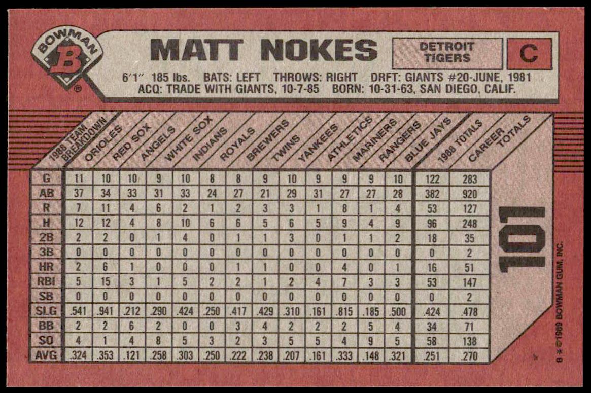 This Baseball card, from 1989 is part of the Bowman  card set. Matt Nokes is featured and has a card number of 101.