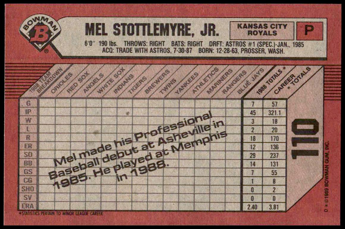 This BaseballΒ card, from 1989 is part of the Bowman Β card set. Mel Stottlemyre, Jr. is featured and has a card number of 110.