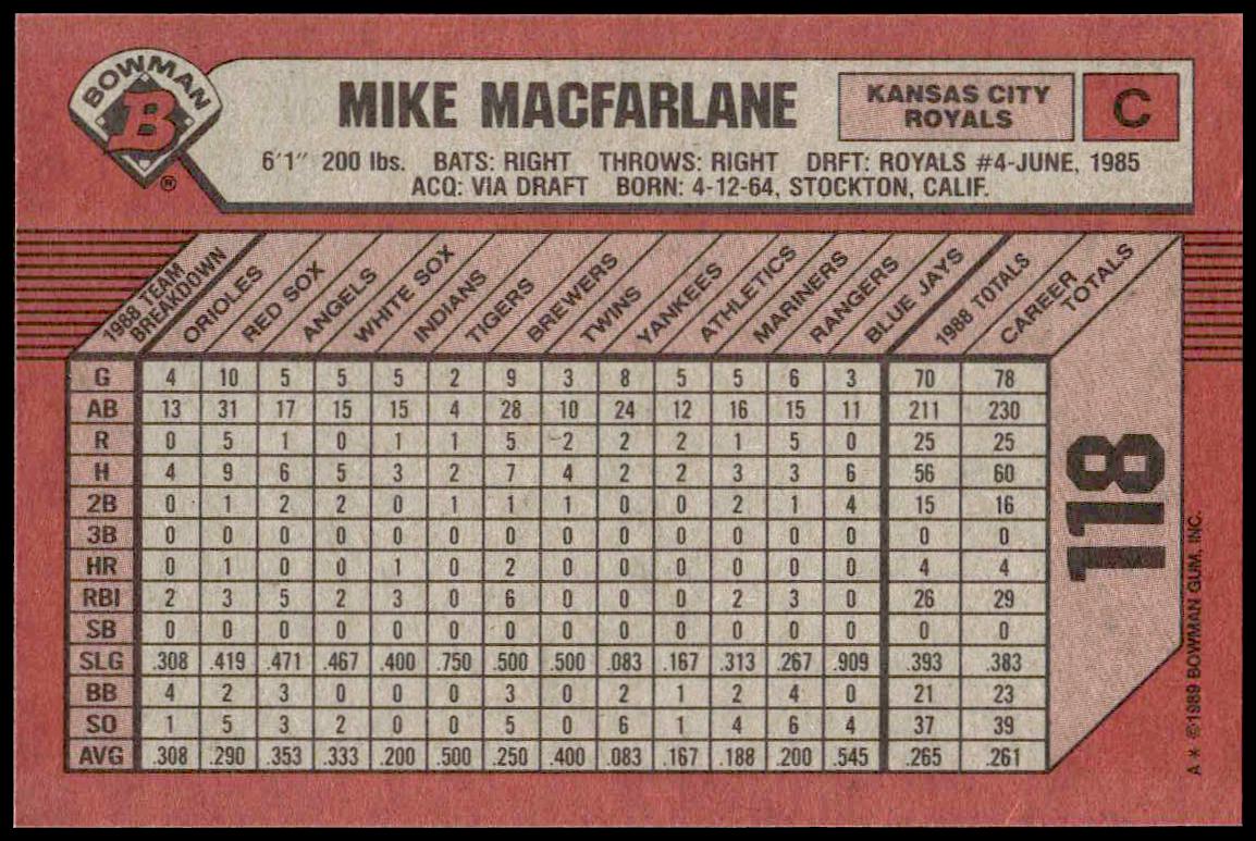This Baseball card, from 1989 is part of the Bowman  card set. Mike Macfarlane is featured and has a card number of 118.