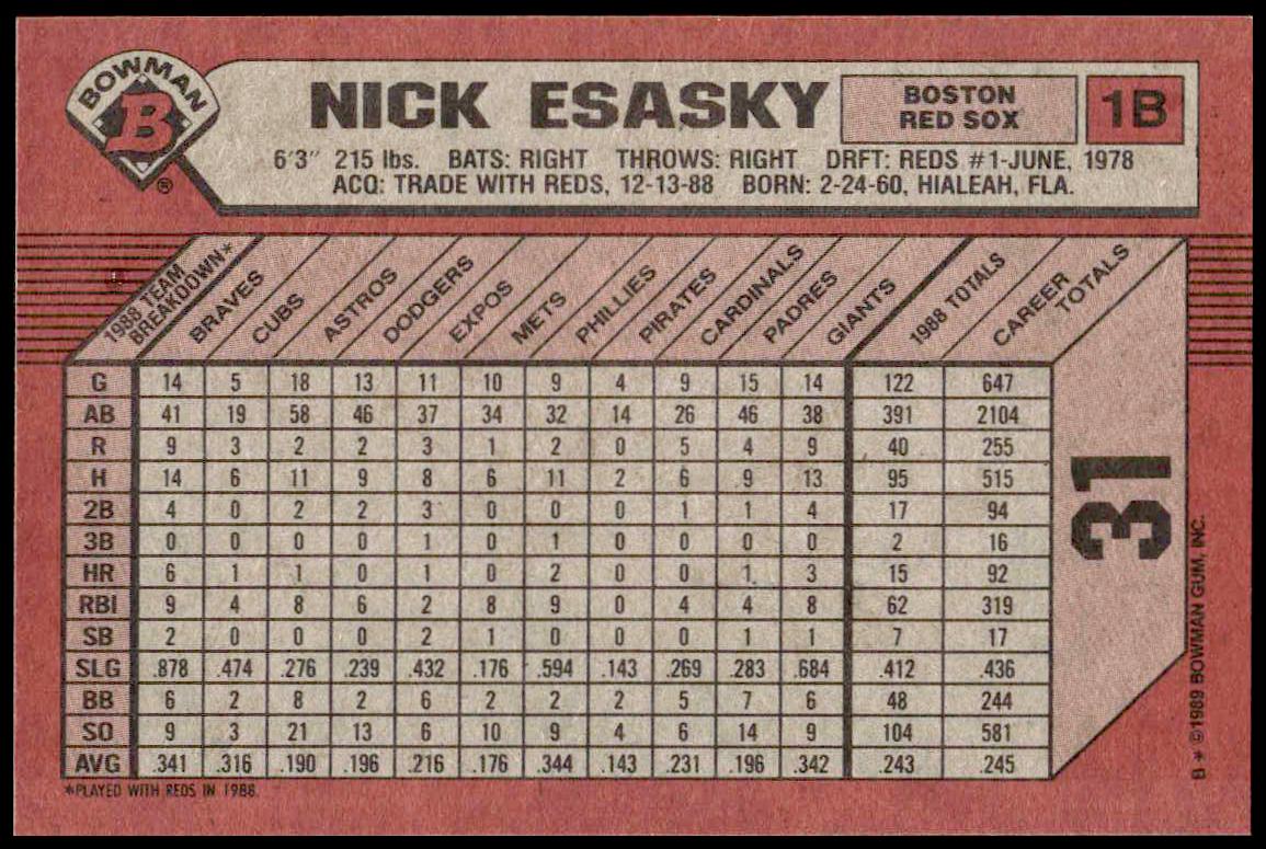 This Baseball card, from 1989 is part of the Bowman  card set. Nick Esasky is featured and has a card number of 31.