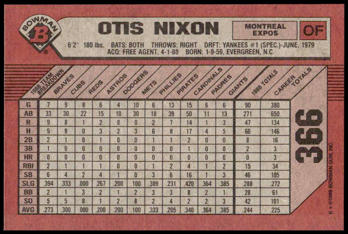 This Baseball card, from 1989 is part of the Bowman  card set. Otis Nixon is featured and has a card number of 366.