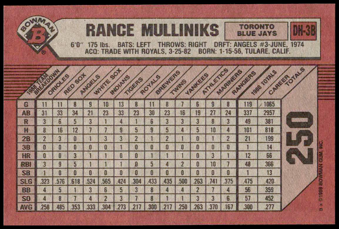 This Baseball card, from 1989 is part of the Bowman  card set. Rance Mulliniks is featured and has a card number of 250.