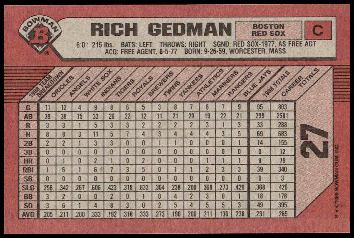 This Baseball card, from 1989 is part of the Bowman  card set. Rich Gedman is featured and has a card number of 27.