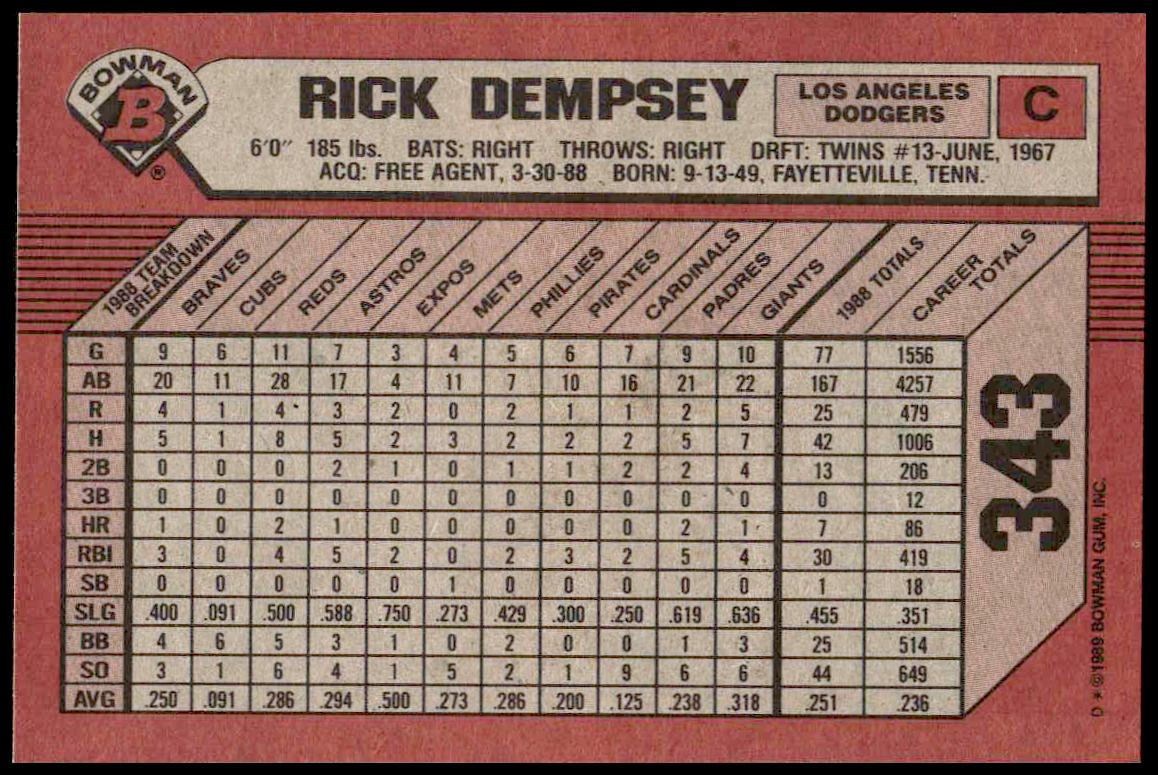 This Baseball card, from 1989 is part of the Bowman  card set. Rick Dempsey is featured and has a card number of 343.