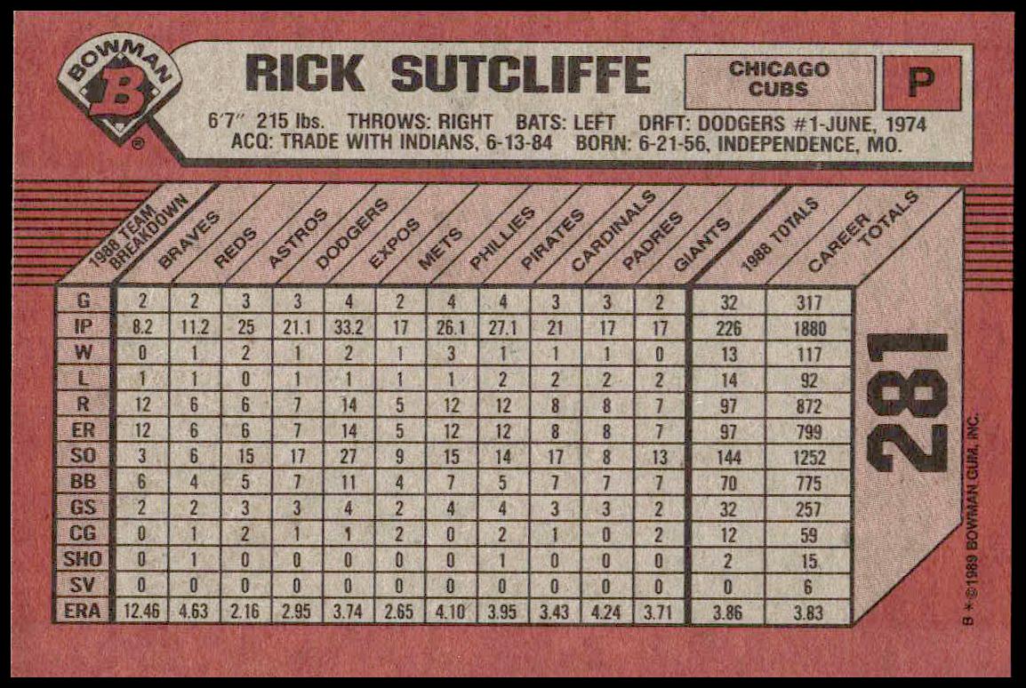 This Baseball card, from 1989 is part of the Bowman  card set. Rick Sutcliffe is featured and has a card number of 281.