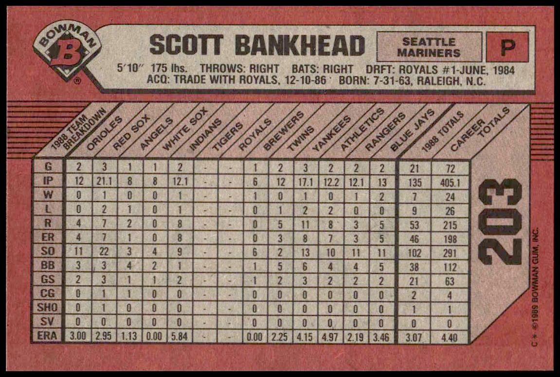 This Baseball card, from 1989 is part of the Bowman  card set. Scott Bankhead is featured and has a card number of 203.