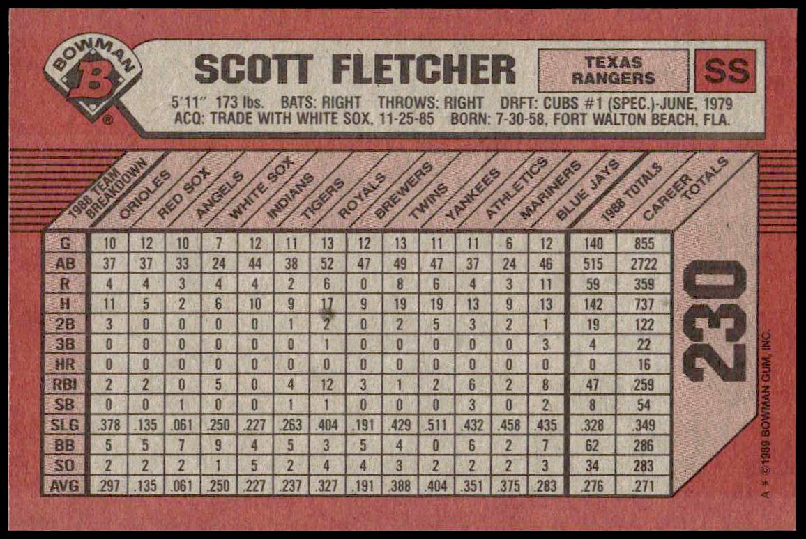 This Baseball card, from 1989 is part of the Bowman  card set. Scott Fletcher is featured and has a card number of 230.