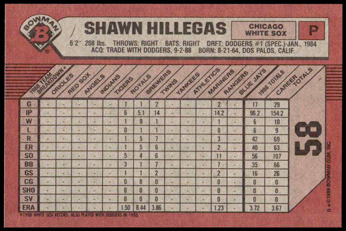 This Baseball card, from 1989 is part of the Bowman  card set. Shawn Hillegas is featured and has a card number of 58.
