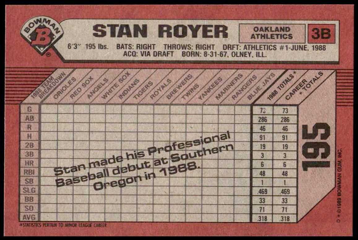 This Baseball card, from 1989 is part of the Bowman  card set. Stan Royer is featured and has a card number of 195.