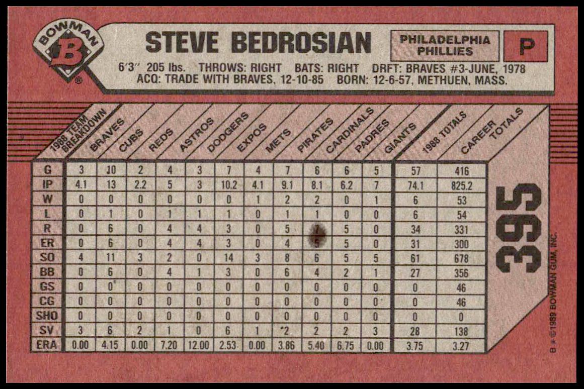 This Baseball card, from 1989 is part of the Bowman  card set. Steve Bedrosian is featured and has a card number of 395.