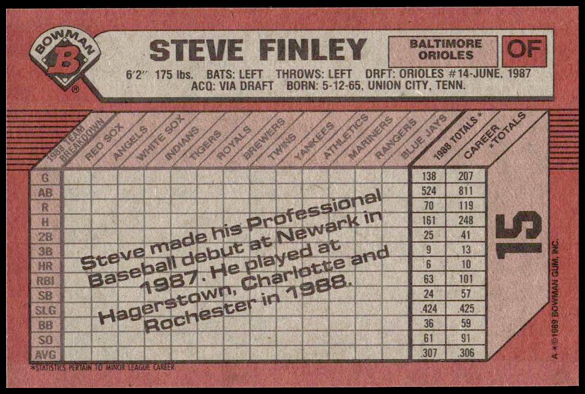 This Baseball card, from 1989 is part of the Bowman  card set. Steve Finley is featured and has a card number of 15.