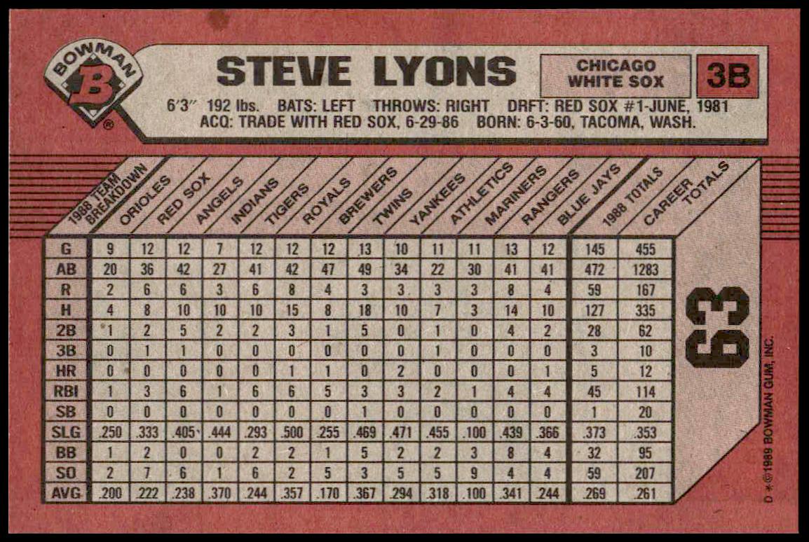 This Baseball card, from 1989 is part of the Bowman  card set. Steve Lyons is featured and has a card number of 63.