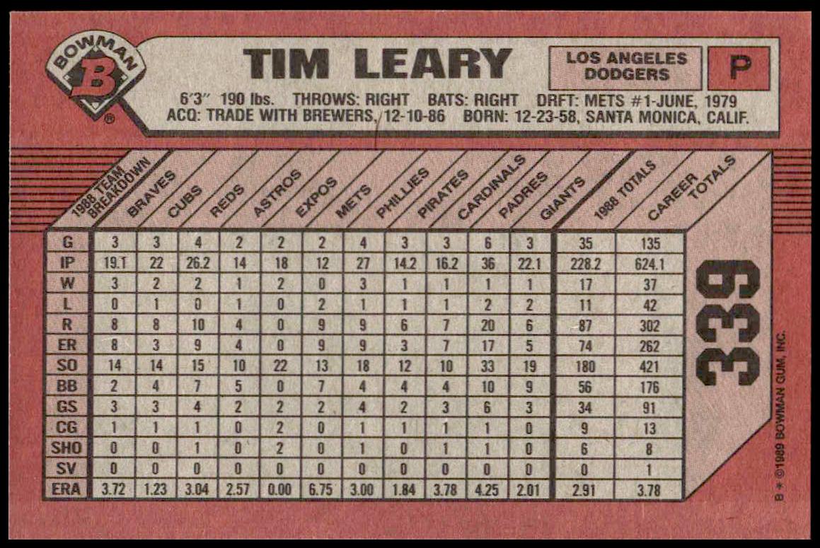 This Baseball card, from 1989 is part of the Bowman  card set. Tim Leary is featured and has a card number of 339.