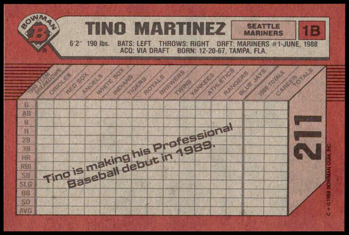 This Baseball card, from 1989 is part of the Bowman  card set. Tino Martinez is featured and has a card number of 211.