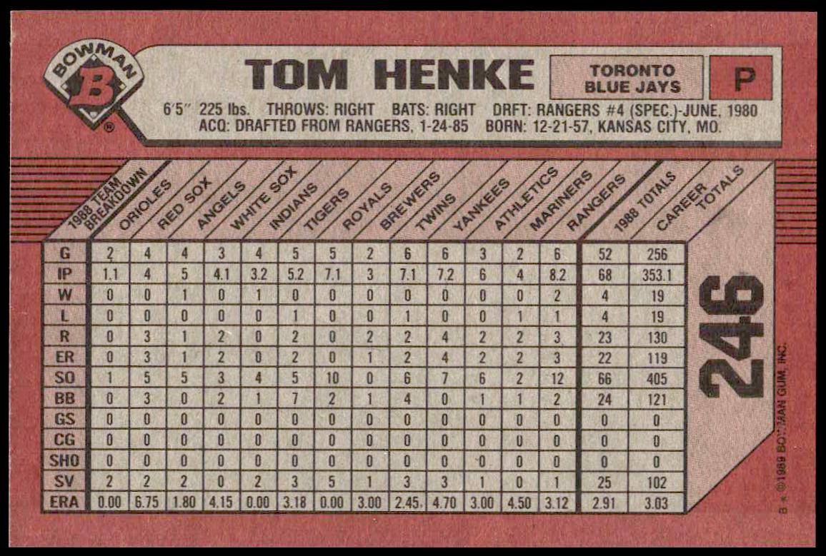 This Baseball card, from 1989 is part of the Bowman  card set. Tom Henke is featured and has a card number of 246.