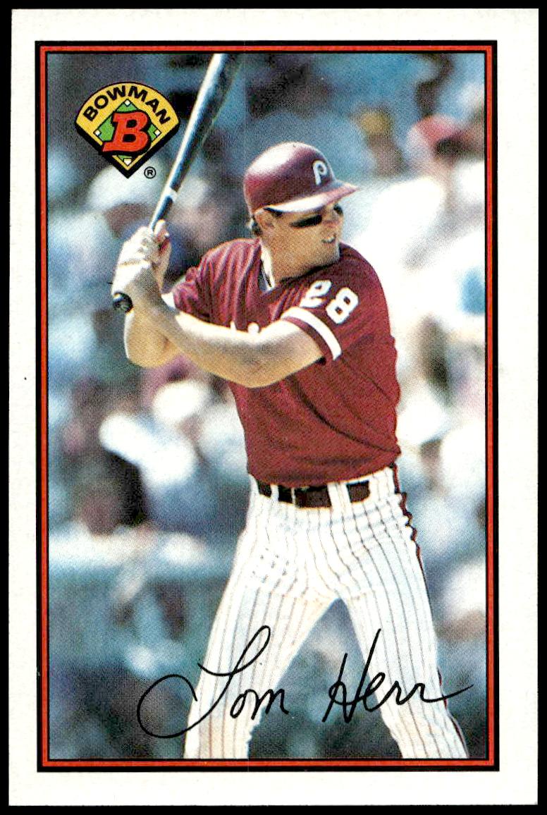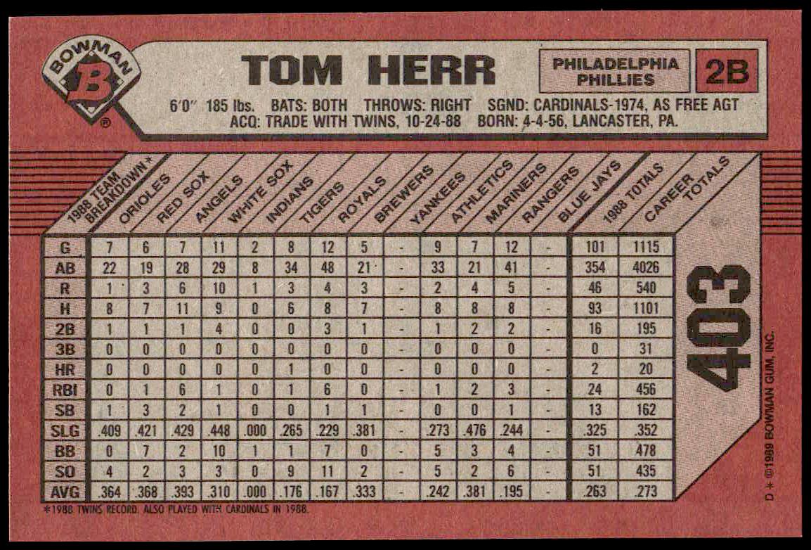 This Baseball card, from 1989 is part of the Bowman  card set. Tom Herr is featured and has a card number of 403.