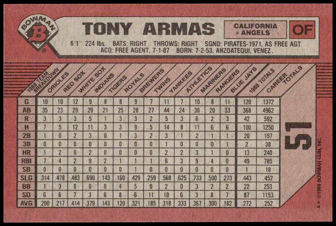 This Baseball card, from 1989 is part of the Bowman  card set. Tony Armas is featured and has a card number of 51.