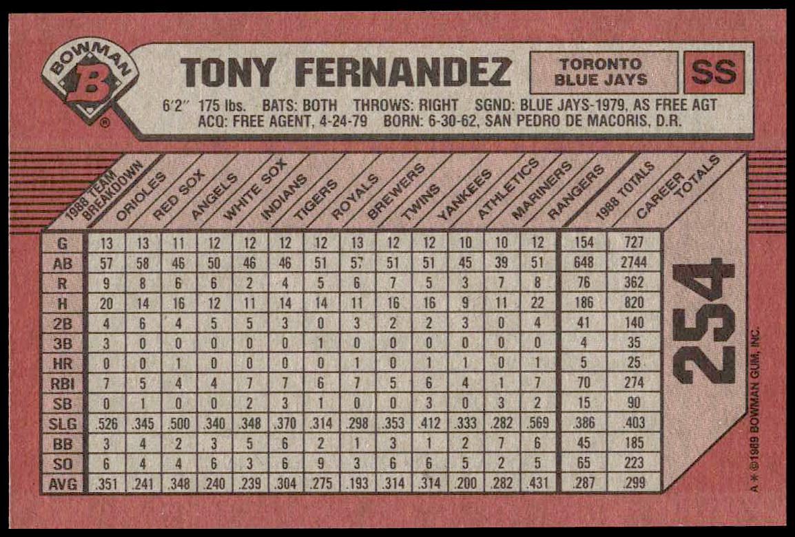 This Baseball card, from 1989 is part of the Bowman  card set. Tony Fernandez is featured and has a card number of 254.