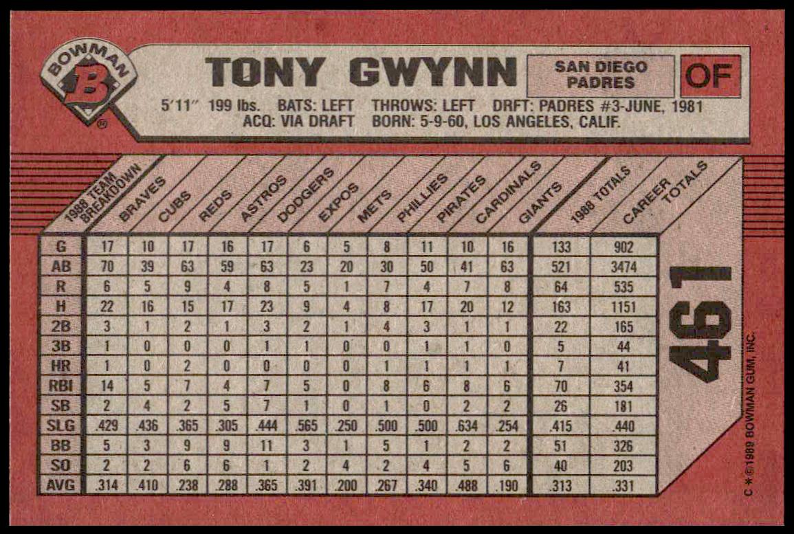 This Baseball card, from 1989 is part of the Bowman  card set. Tony Gwynn is featured and has a card number of 461.