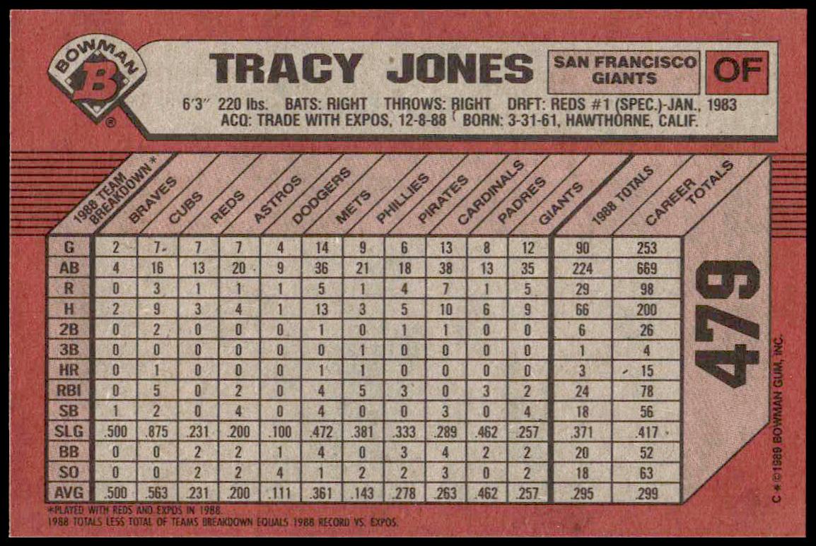 This Baseball card, from 1989 is part of the Bowman  card set. Tracy Jones is featured and has a card number of 479.
