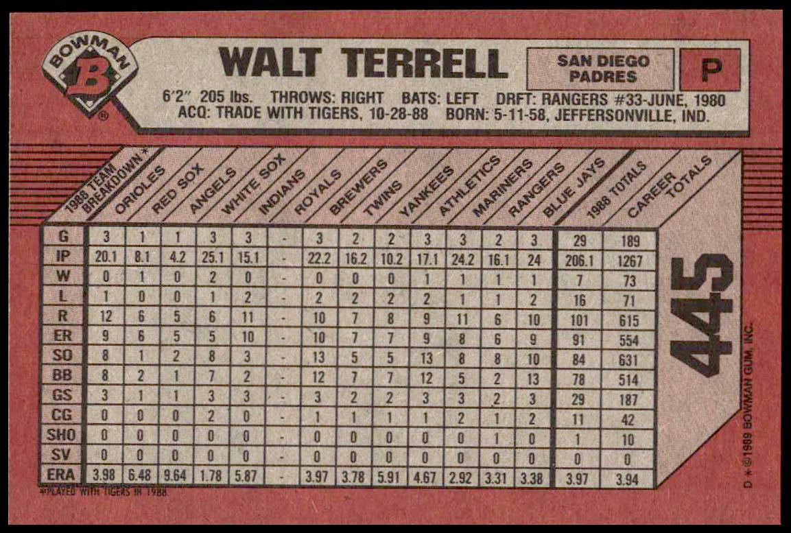 This Baseball card, from 1989 is part of the Bowman  card set. Walt Terrell is featured and has a card number of 445.