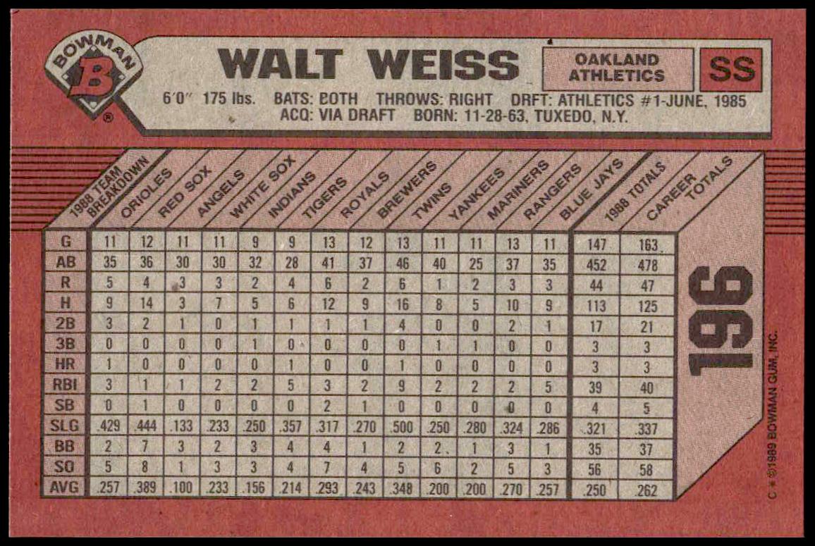 This Baseball card, from 1989 is part of the Bowman  card set. Walt Weiss is featured and has a card number of 196.