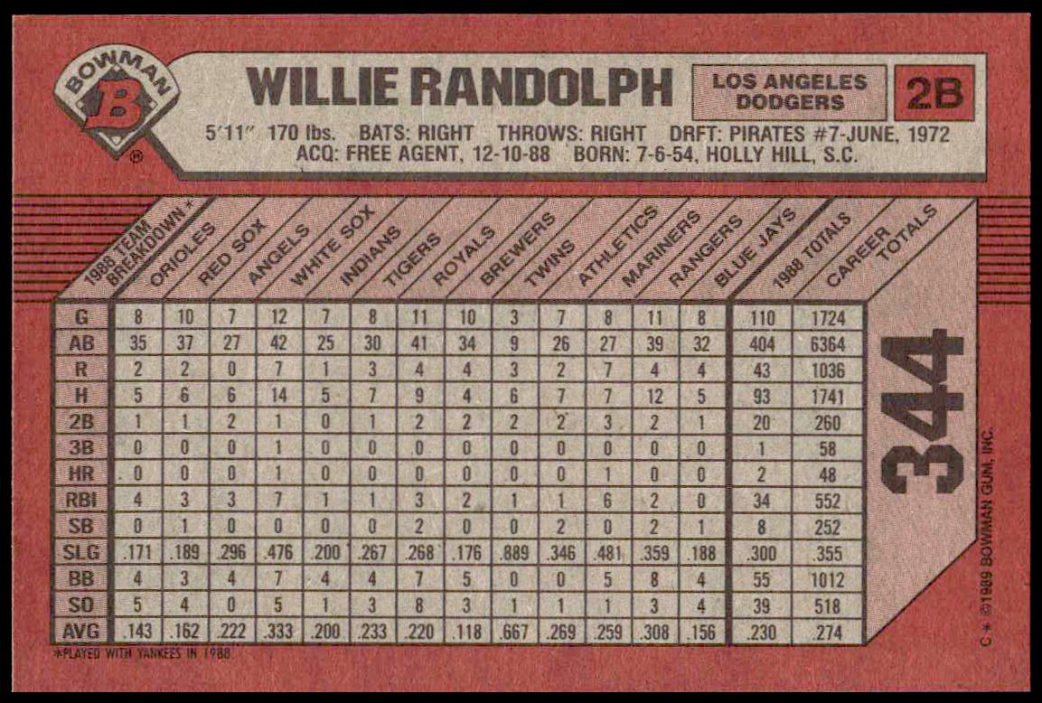 This Baseball card, from 1989 is part of the Bowman  card set. Willie Randolph is featured and has a card number of 344.