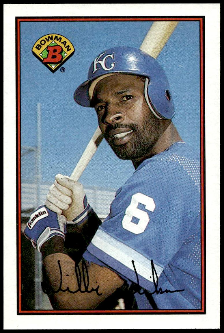 This Baseball card, from 1989 is part of the Bowman  card set. Willie Wilson is featured and has a card number of 124.