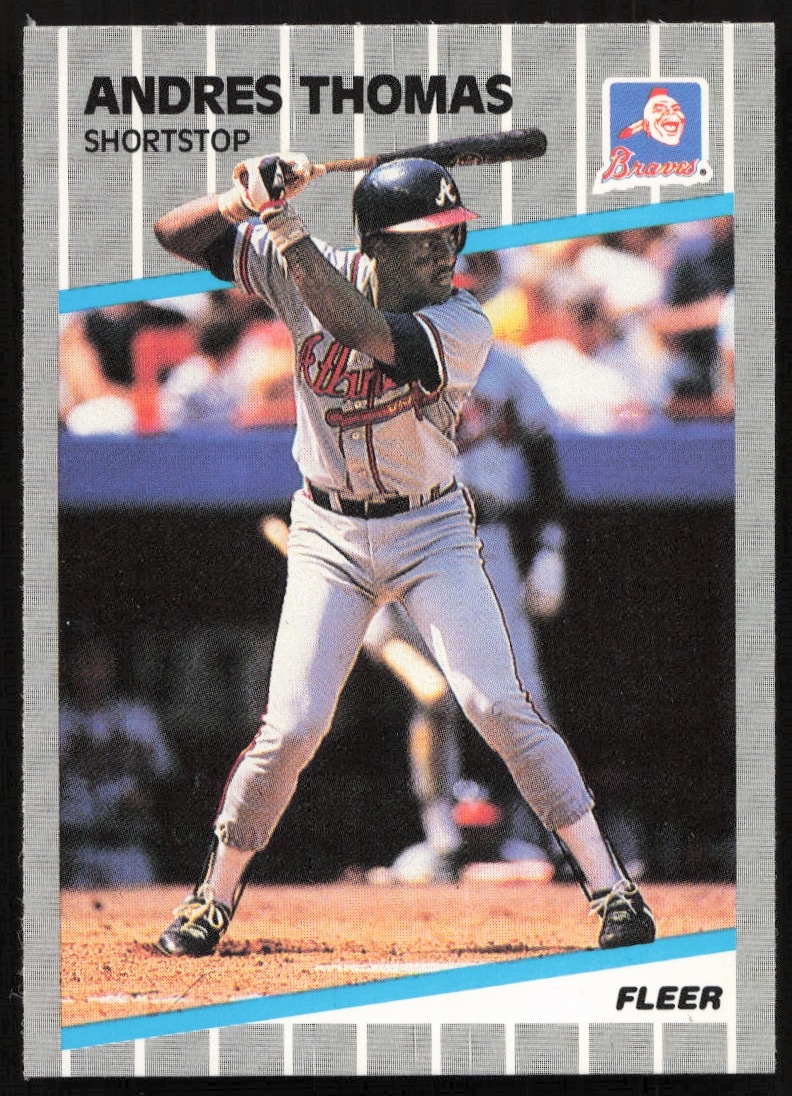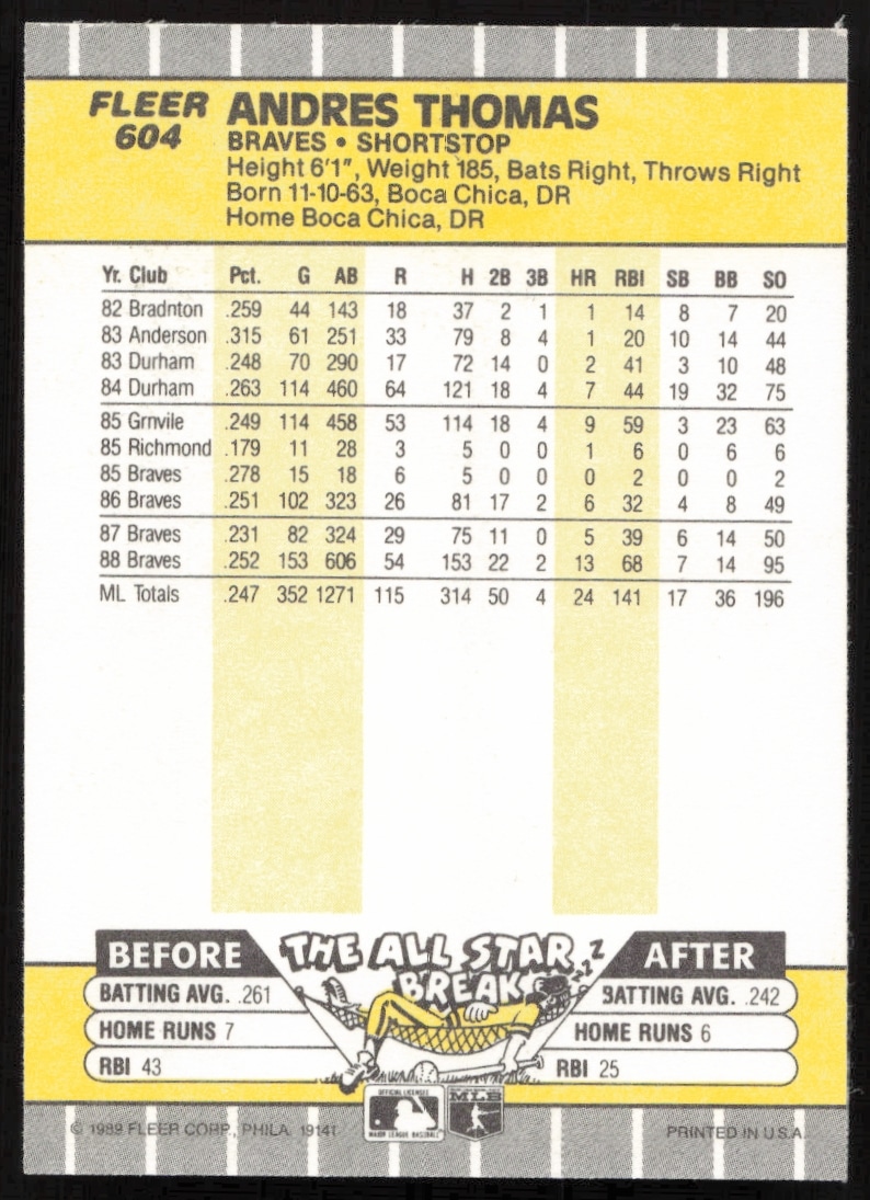 This Baseball card, from 1989 is part of the Fleer card set. Andres Thomas is featured and has a card number of 604.