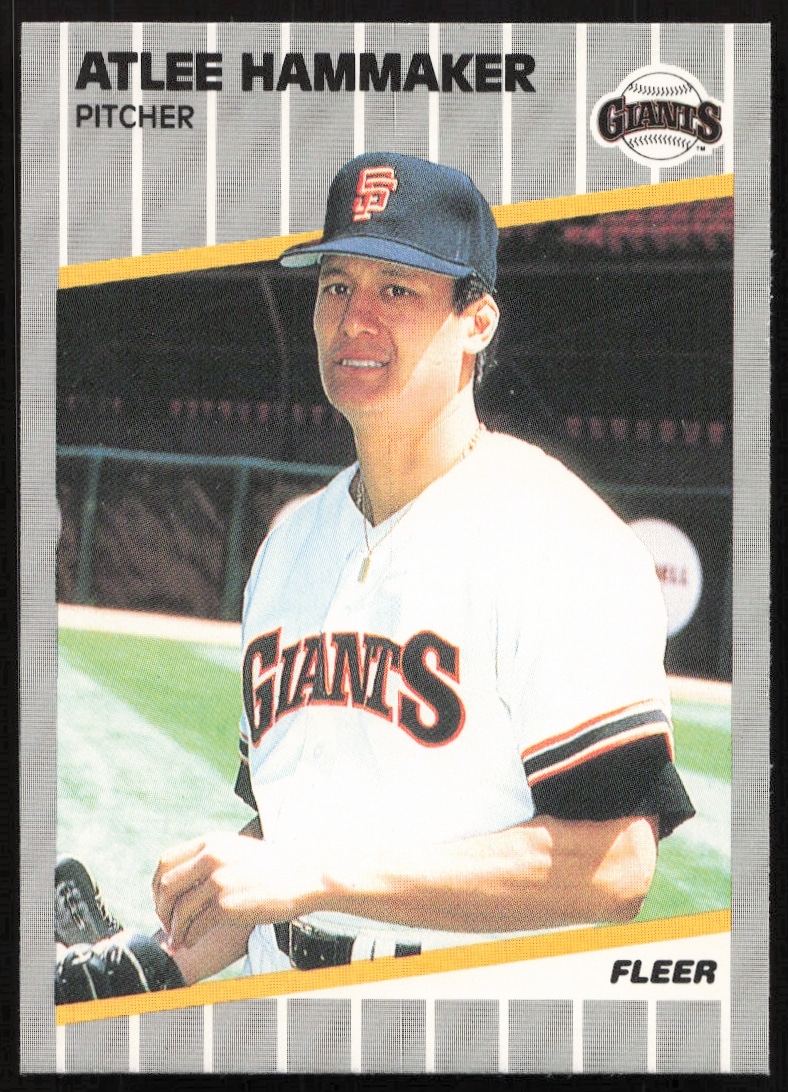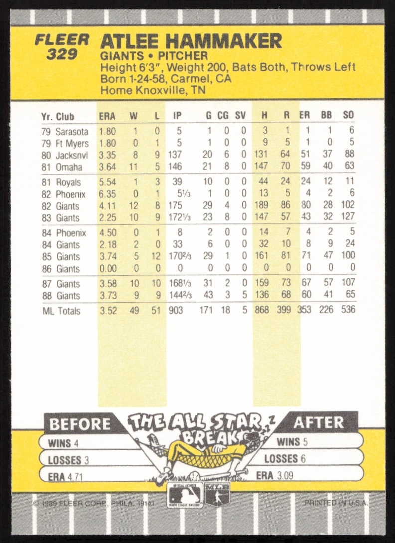 This Baseball card, from 1989 is part of the Fleer card set. Atlee Hammaker is featured and has a card number of 329.