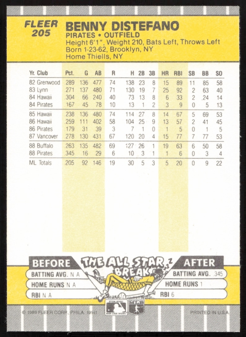 This Baseball card, from 1989 is part of the Fleer card set. Benny Distefano is featured and has a card number of 205.