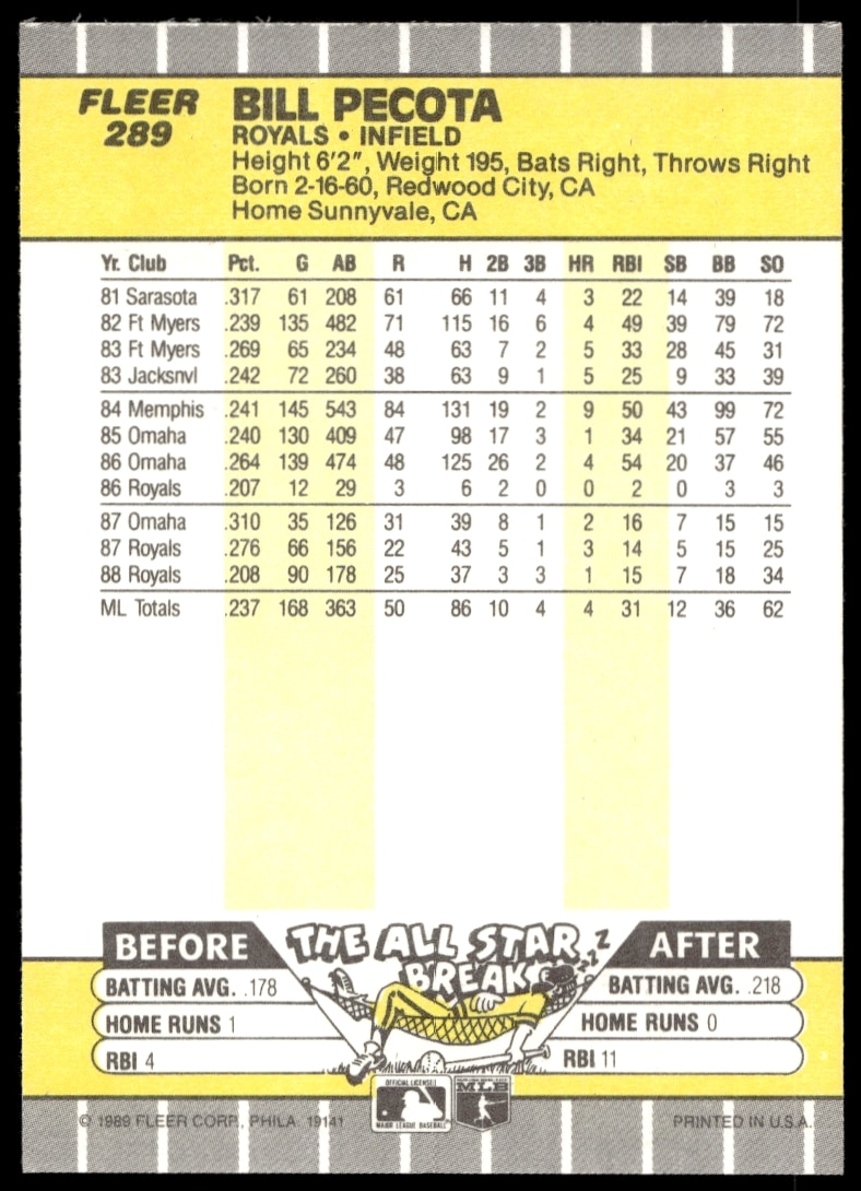 This Baseball card, from 1989 is part of the Fleer card set. Bill Pecota is featured and has a card number of 289.